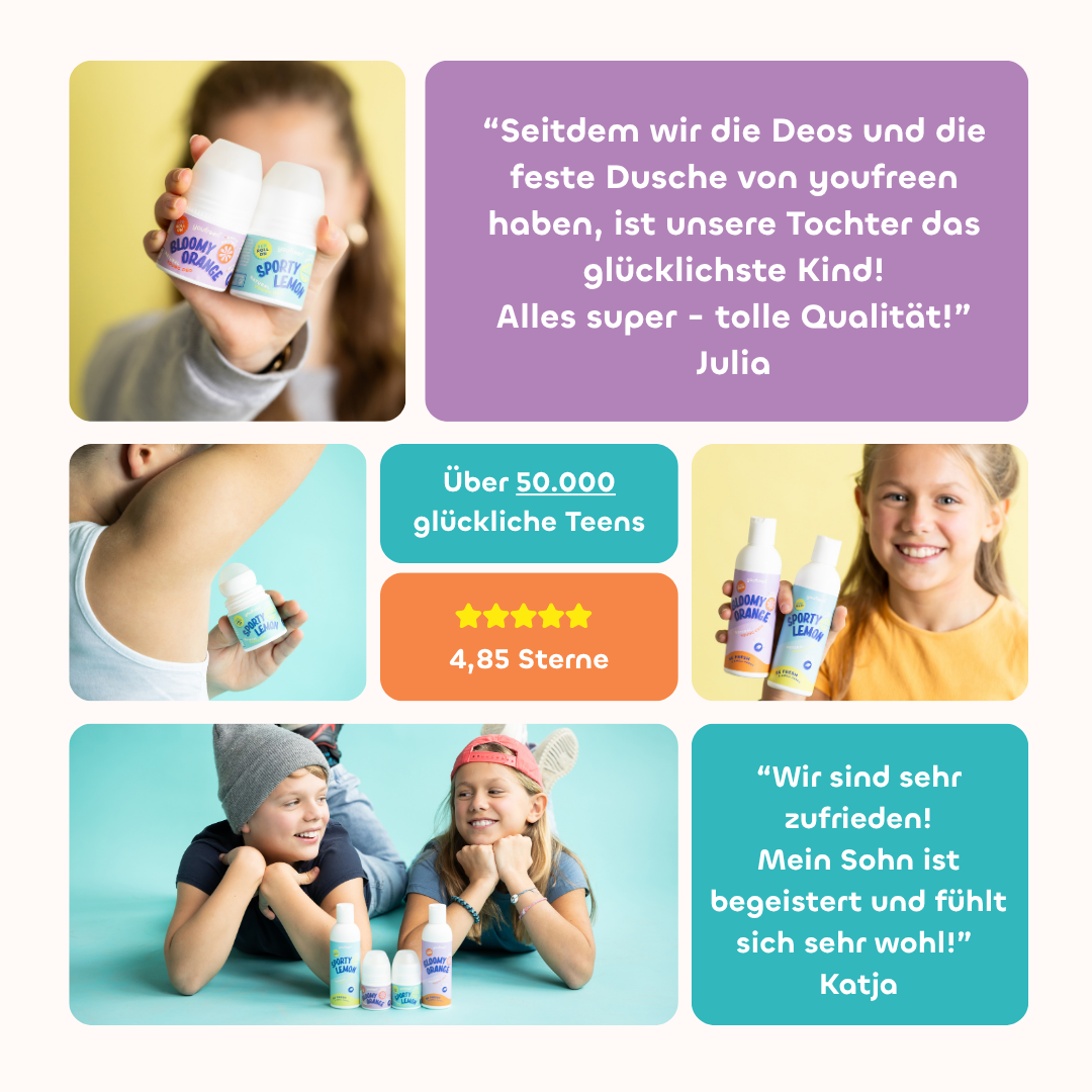 Zusammen mit erfahrenen Experten im Bereich Naturkosmetik haben wir die youfreen Deos und Pflegeprodukte für Mädchen und Jungen entwickelt. Mit milden und pflanzlichen Inhaltsstoffen. Damit die Haut nicht gestört wird und die natürliche Hautflora geschont wird. Und ganz wichtig: mit zuverlässigem Schutz. Denn die effektive Wirkung ist schließlich die Hauptsache. Bei der Auswahl der Düfte unterstützen uns Kids & Teens, denn ihnen müssten diese natürlich gefallen.