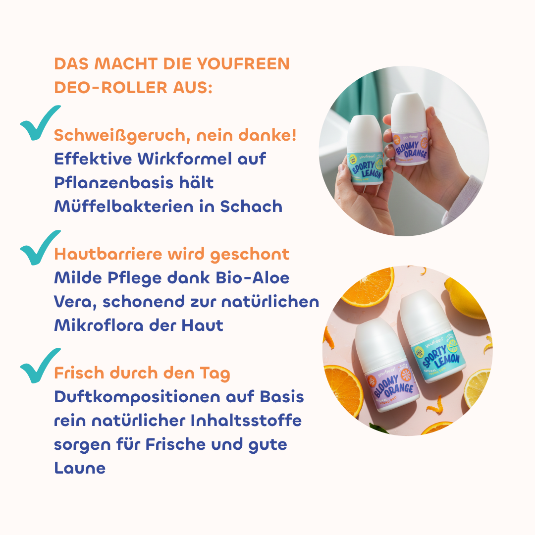 Zusammen mit erfahrenen Experten im Bereich Naturkosmetik haben wir die youfreen Deos und Pflegeprodukte für Mädchen und Jungen entwickelt. Mit milden und pflanzlichen Inhaltsstoffen. Damit die Haut nicht gestört wird und die natürliche Hautflora geschont wird. Und ganz wichtig: mit zuverlässigem Schutz. Denn die effektive Wirkung ist schließlich die Hauptsache. Bei der Auswahl der Düfte unterstützen uns Kids & Teens, denn ihnen müssten diese natürlich gefallen.